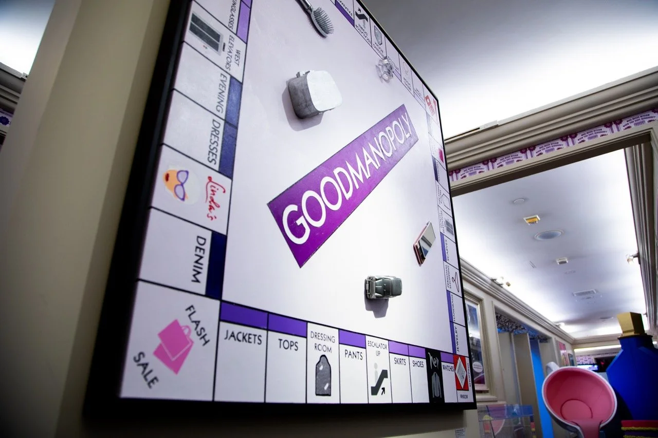 High fashion meets board game brilliance with Kristin Simmons' "Goodmanopoly." This isn't your grandmother's Monopoly; it's a high-stakes, high-style adventure with a playful yet pointed critique of luxury consumerism. Kristin transforms familiar Monopoly elements into a stylish battleground for fashion's finest, replacing mundane properties with swanky departments like "Dresses," "Accessories," and "Hosiery." Each square is a stop in an upscale shopping spree, inviting viewers to reflect on the seductive power of retail therapy.