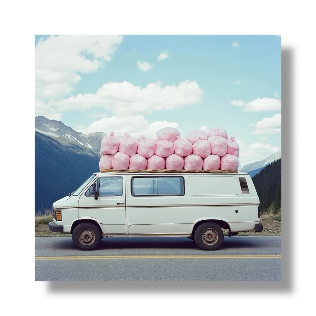 A red pill bottle sits proudly on the light yellow canvas, catching the eye with its vibrant hue. The surface of “Baby Dolls: Mellow Yellow” shimmers with silver glitter, creating a mesmerizing spectacle. Pouring out from the bottle are tiny blue Barbie shoes, which Simmons has scattered haphazardly across the glitter like a playful cascade of memories. Together, the contrasting colors and unexpected objects invite viewers to enter a realm where dreams come in pill bottles and fashion is the ultimate escape.