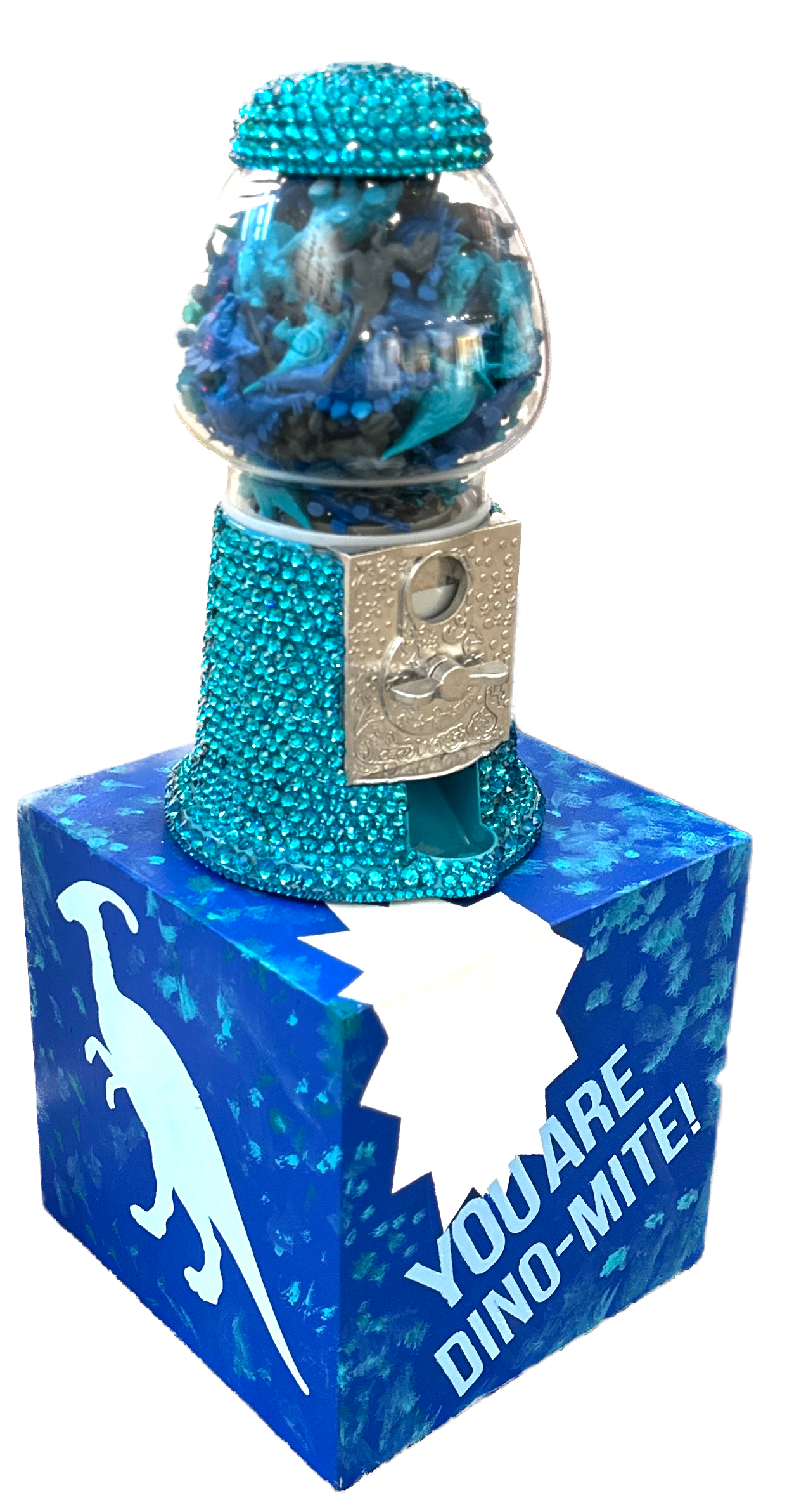 Nestled in the heart of a whimsical art gallery, the Enchanted Dino Dispenser stands proud as a vibrant and captivating masterpiece. Crafted with meticulous care, this art sculpture takes the shape of a glistening bedazzled gumball machine, a nostalgic relic from a bygone era. Embodying the spirit of childhood wonder, the machine entices viewers with its shimmering facade, dazzling under the gallery lights. Instead of the expected sugary treasures, within its glass enclosure resides a mesmerizing assortment of plastic dinosaur toys. From soothing cerulean to the deepest sapphire, the miniature prehistoric creatures create a tranquil ambiance, evoking a sense of serene exploration. As visitors gaze upon this whimsical fusion of childhood delight and artistic brilliance, they are transported to a world where imagination and enchantment merge, rekindling a sense of joy and wonder long forgotten.